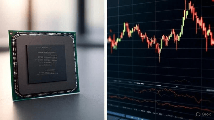 Computer chip on left, stock chart on right